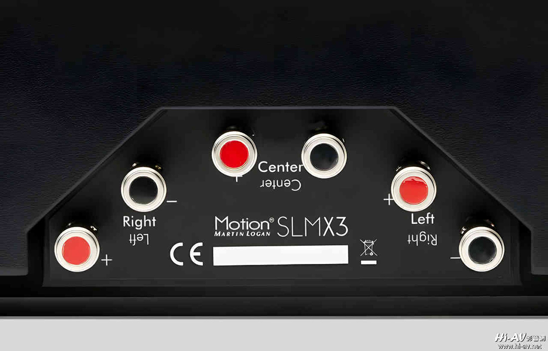Martin Logan Motion SLM X3喇叭為三聲道整合設計,喇叭端子設置在背面中央下緣,由於它可以上下兩個方向裝設,原廠很貼心地將Right、Center與Right都有正反兩面標註,方便用家接喇叭線時正反兩面都可看著標註文字直覺對應。
