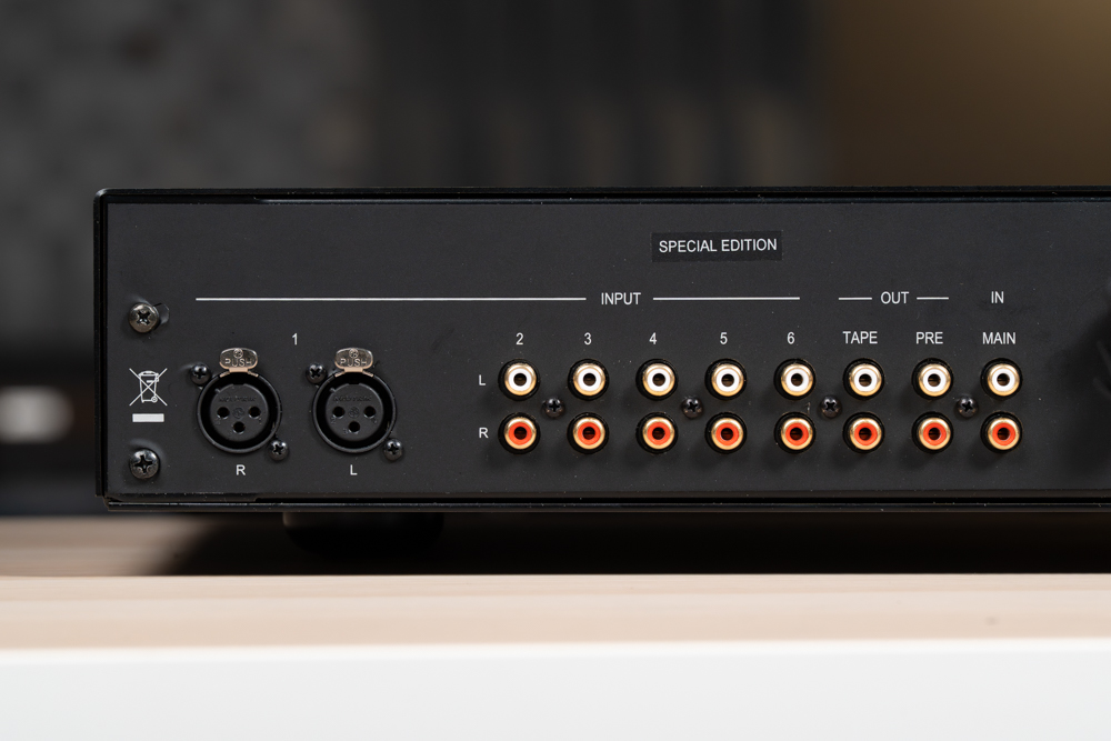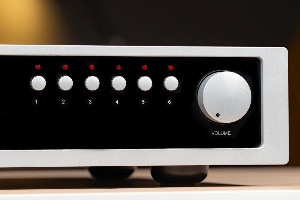 以綜合擴大機來說,MA360 SE 的設計可說相當規矩,甚至覺得有點老派,機器面板上的功能鍵,左邊開始是電源開關,右邊則是 1~6 輸入的選擇按鍵,最右邊是圓形音量旋鈕,相當簡潔。