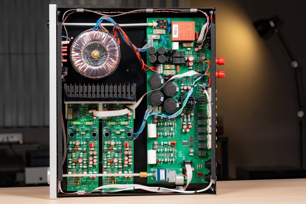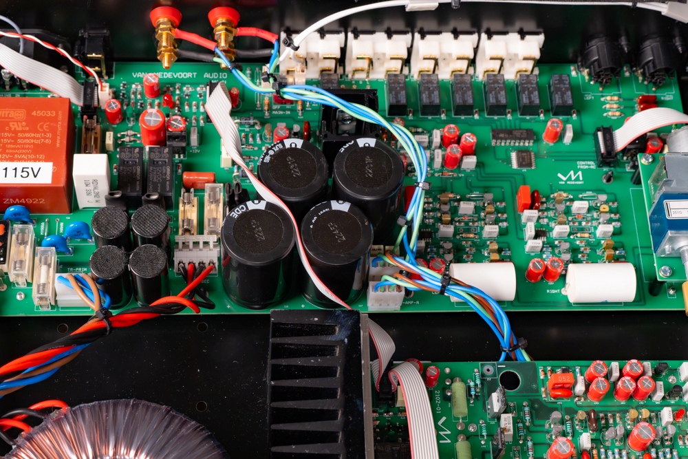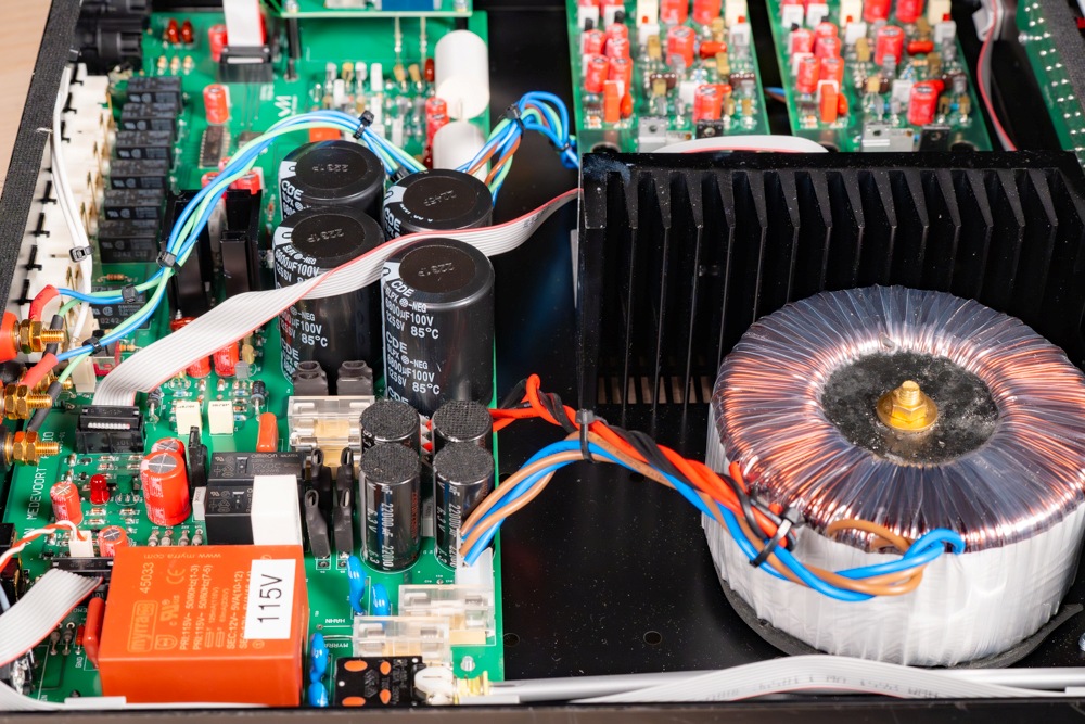在 MA360 SE 機箱後半部,則是一大塊電路板,左半部是電源濾波,可以看到電容頂部有阻尼強化,右半部則是前級放大線路,左右聲道獨立分砌,連接機箱右前方的功率放大線路,左右聲道刻意做成兩塊 PCB 板,藉由雙單聲道設計提高聲道分離度。