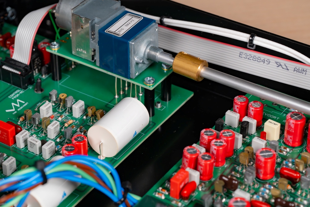音量控制的 Alps 可變電阻,裝在後方的 PCB 板上面,盡可能與前級放大線路拉近距離,讓音樂訊號走最短路徑,所以前方的音量控制旋鈕,使用金屬棒機械連動 Alps 可變電阻。