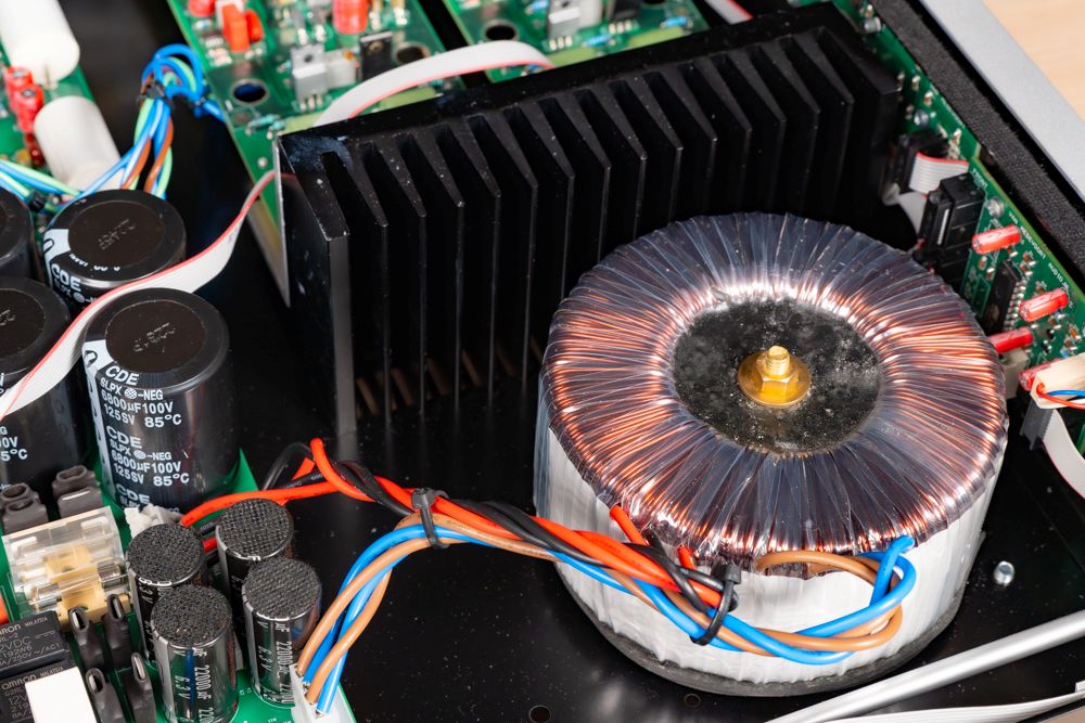 拆機之後,可以清楚看見 MA360 SE 大致區分為三個部分,大尺寸環形變壓器,佔據機箱前半部約莫 1/2 的空間,對於一部標示 150W 立體聲綜擴來說,其供電量高達 350 瓦,代表供電餘裕度相當夠,不用擔心大功率輸出時產生動態壓縮。