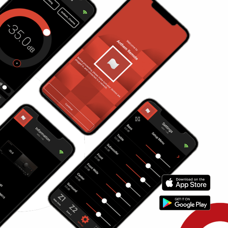 Anthem Remote App 透過 Wi-Fi 連線,簡化對支援機種的各項設定。應用程式控制功能包括:音量調整、靜音、輸入選擇、電源開關、聆聽模式、低音與高音調整、聲道微調、選單瀏覽,以及 ARC(Anthem Room Correction)室內聲學修正控制。