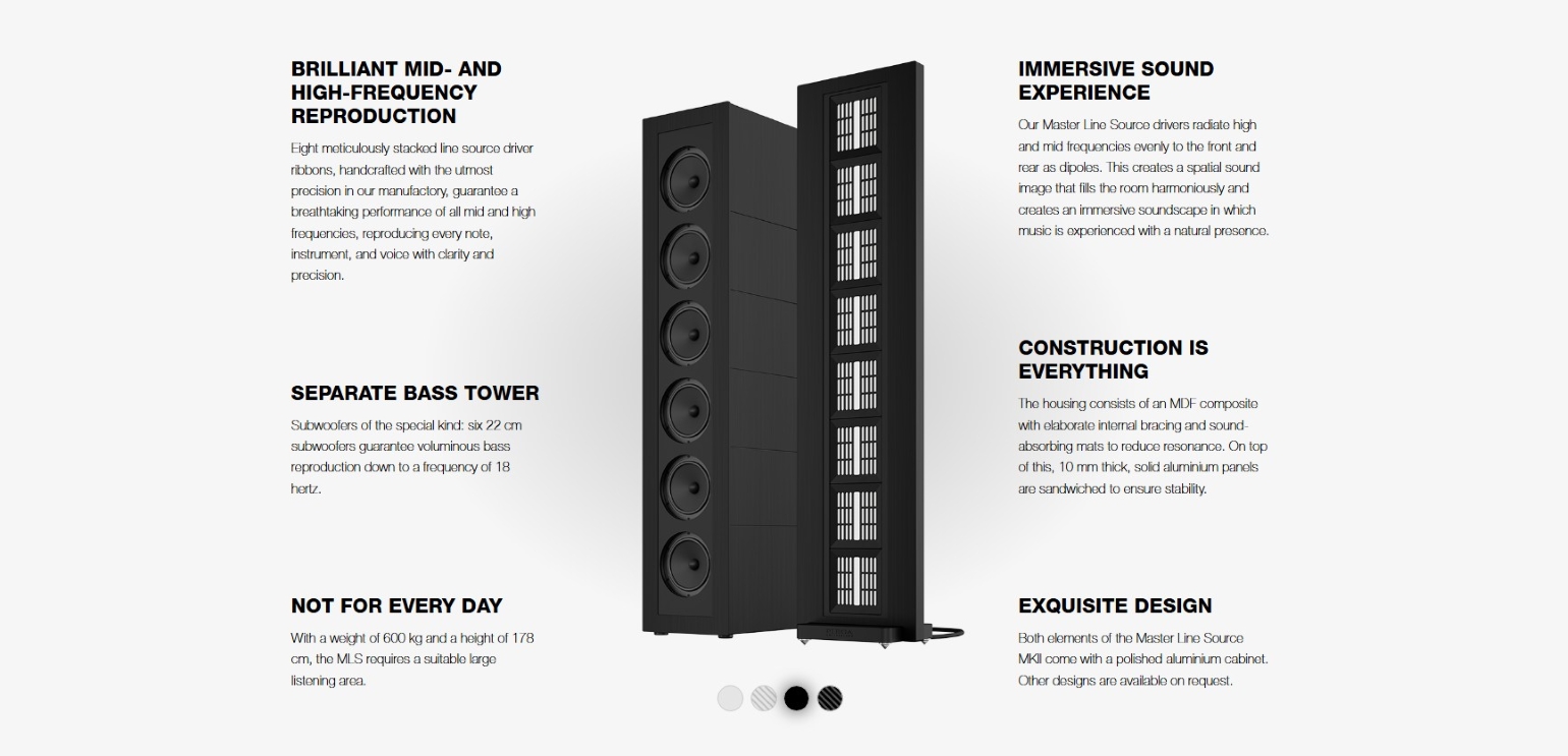 此外,線音源具備優異的瞬態響應,能完整呈現樂器的動態範圍,使大型交響樂團展現出真實而充滿活力的演出效果。中音單體的對稱排列亦可改善水平擴散特性,並營造出更為均勻一致的音場表現。